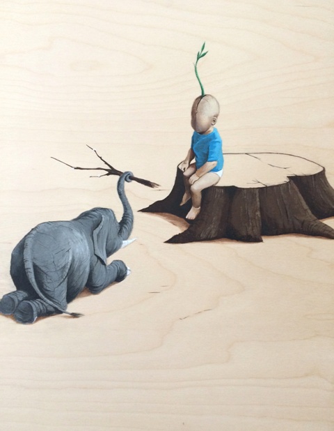 A man seeks counsel from a whale as a murder of crows fly overhead; a young elephant crouches in front of a faceless child sitting on a tree stump, offering a branch with its trunk; and a goldfish in mid-air looks upon the focused gaze of a crow. These dreamlike apparitions are the beautifully-rendered imaginings of artist Emmanuel Crespo in his new exhibit, “Talking Through the Door.”